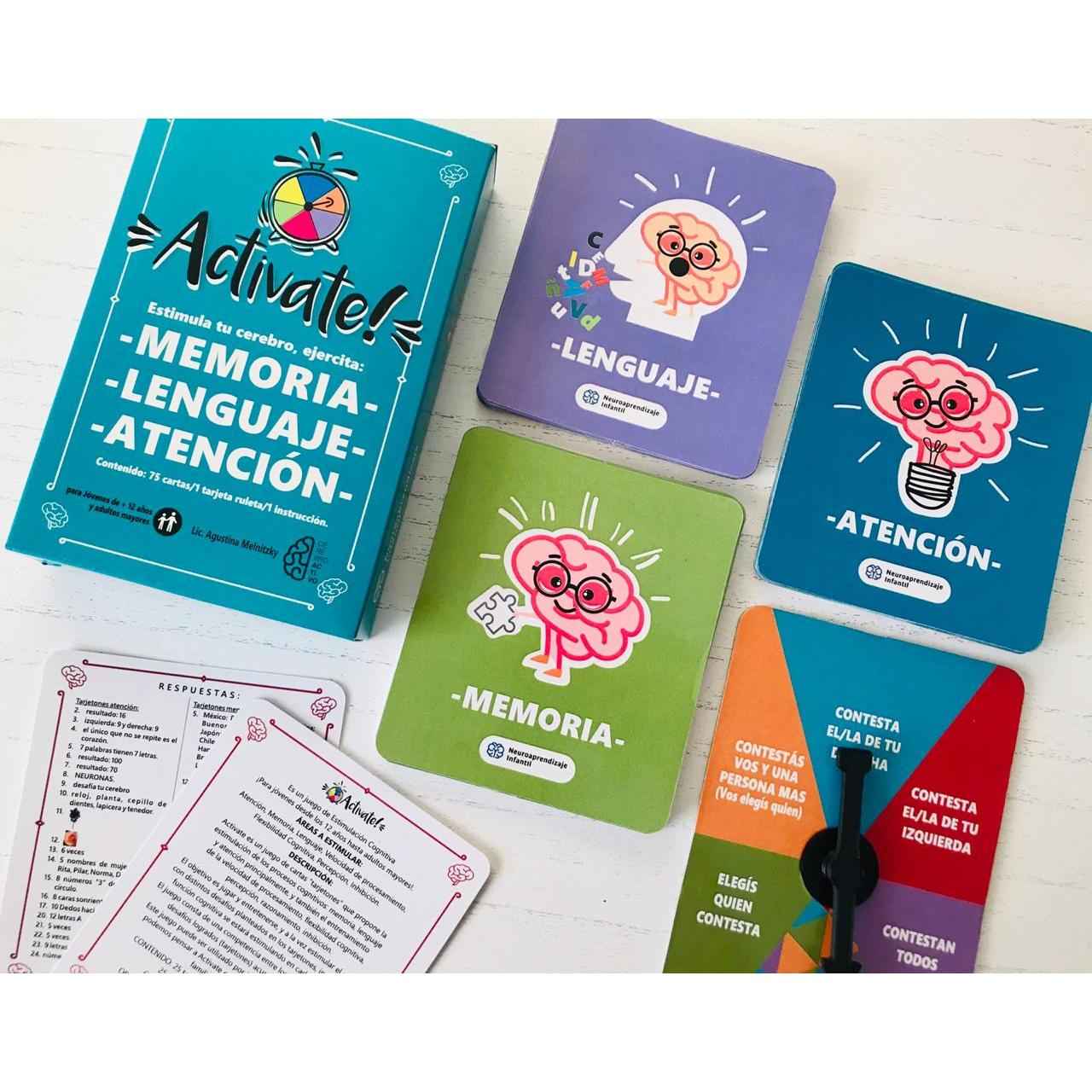 El objetivo es jugar y entretenerse, y a la vez estimular el cerebro con distintos desafíos planteados en los tarjetones, indicando que función cognitiva se estará estimulando en cada uno de ellos. El juego consta de una competencia entre los jugadores, quien mas desafíos logrados acumule, será el ganador. Este juego puede ser utilizado por jóvenes hasta adultos mayores, podemos pensar ACTIVATE como un juego capaz de reunir a la familia y estimular juntos.