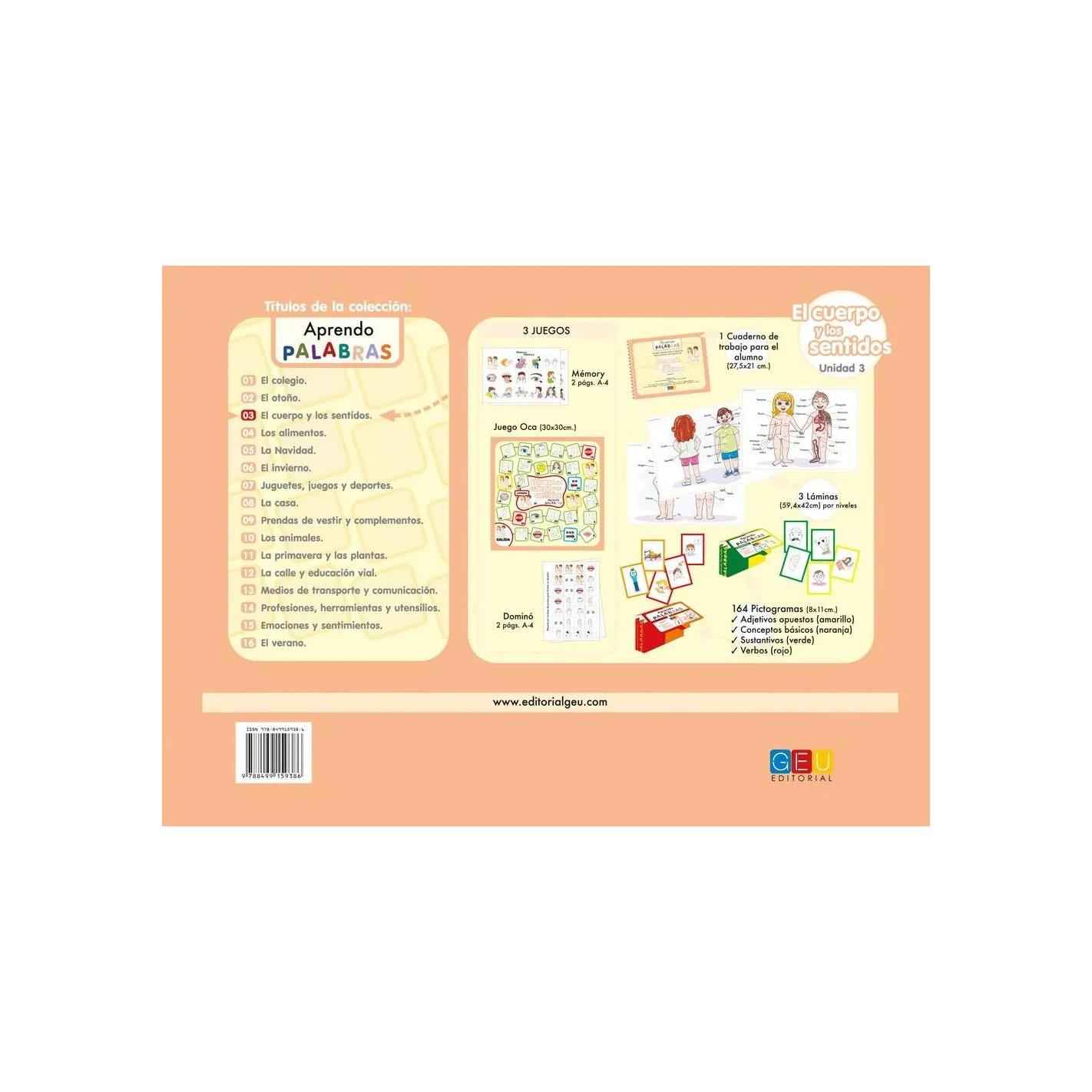 Aprendo palabras 3. El cuerpo y los sentidos forma parte de la colección Aprendo palabras, un novedoso material que trabaja el aspecto léxico-semántico y morfosintáctico del lenguaje oral, tanto a nivel comprensivo como expresivo. Es un material fácil de usar por los más pequeños, que trabaja por unidades didácticas los centros de interés más importantes (colegio, cuerpo, animales, casa, verano, etc.), englobando el aprendizaje del vocabulario mediante actividades de conciencia fonológica, definiciones, categorías, morfosintaxis, etc. Diseñado para Maestros de Educación Infantil, Audición y Lenguaje, Pedagogía Terapéutica, Educación Compensatoria, Logopedas y Pedagogos. En este título se trabajan actividades como: Señalar de cada fila lo que no pertenece al cuerpo. Unir los dibujos con puntos. Colorear de cada fila lo que no pertenece al cuerpo. Recortar y pegar. Dibujar hasta completar la figura. PRINCIPALES OBJETIVOS Adquirir y comprender el vocabulario básico para la vida diaria (sustantivos,verbos,adjetivos opuestos y conceptos básicos). Aprender de una forma divertida mediante actividades,fichas,juegos y láminas de expresión. Desarrollar la conciencia fonológica,la concordancia de género-número y su funcionalidad. Aprender a clasificar diferentes objetos por categorías. Iniciarse en la definición y descripción de personas,animales u objetos. Emplear el léxico para formar y completar oraciones de una forma sencilla. Descubre la forma más divertida de aprender el lenguaje oral, descubre Aprendo palabras.