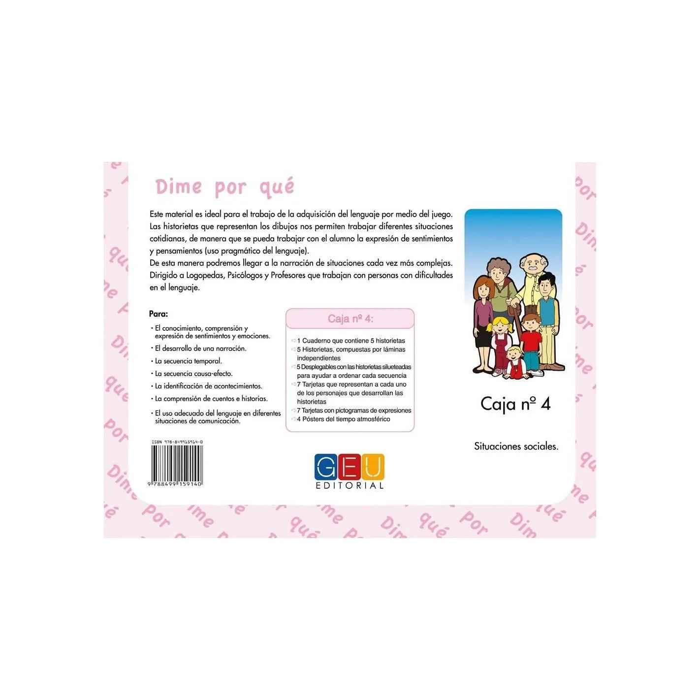 Dime por qué. Caja 4 forma parte de la colección Dime por qué, diseñada para trabajar el sentido pragmático del lenguaje y mejorar la comprensión en los más pequeños. ¿Necesitan comprender el por qué de las situaciones? Dime por qué es la herramienta idónea para que logopedas y terapeutas desarrollen la función pragmática del lenguaje. Gracias a situaciones cotidianas el alumno aprenderá a ordenar las secuencias y comprender por qué el protagonista llora, está contento o tiene sed. Esta caja trata sobre aspectos de acontecimientos importantes (nacimiento de un hermano o hermana, visita al circo, Navidad, un día de colegio, etc.). La caja nº 4 de Dime por qué contiene: 1 cuaderno que contiene 5 historietas. 5 historietas, compuestas por láminas independientes. 5 desplegables con las historietas silueteadas para ayudar a ordenar cada secuencia. 7 tarjetas que representan a cada uno de los personajes que desarrollan las historietas. 7 tarjetas con pictogramas de expresiones. 4 pósters del tiempo atmosférico. PRINCIPALES OBJETIVOS Ayudar a entender al niño la consecuencia que produce una causa/acción. Desarrollar la narración autónoma del alumno. Facilitar la identificación de la relación causa-efecto. Ayudar a comprender diferentes acontecimientos importantes. Estimular la comprensión de narraciones cortas. Impulsar la identificación, comprensión y expresión de sentimientos y emociones. Educar para hacer un uso adecuado del lenguaje y facilitar su comunicación. Contiene 5 historietas diferentes, 7 tarjetas de personajes y 7 tarjetas de expresiones. Dales la forma más divertida de aprender la relación causa-efecto con Dime por qué.