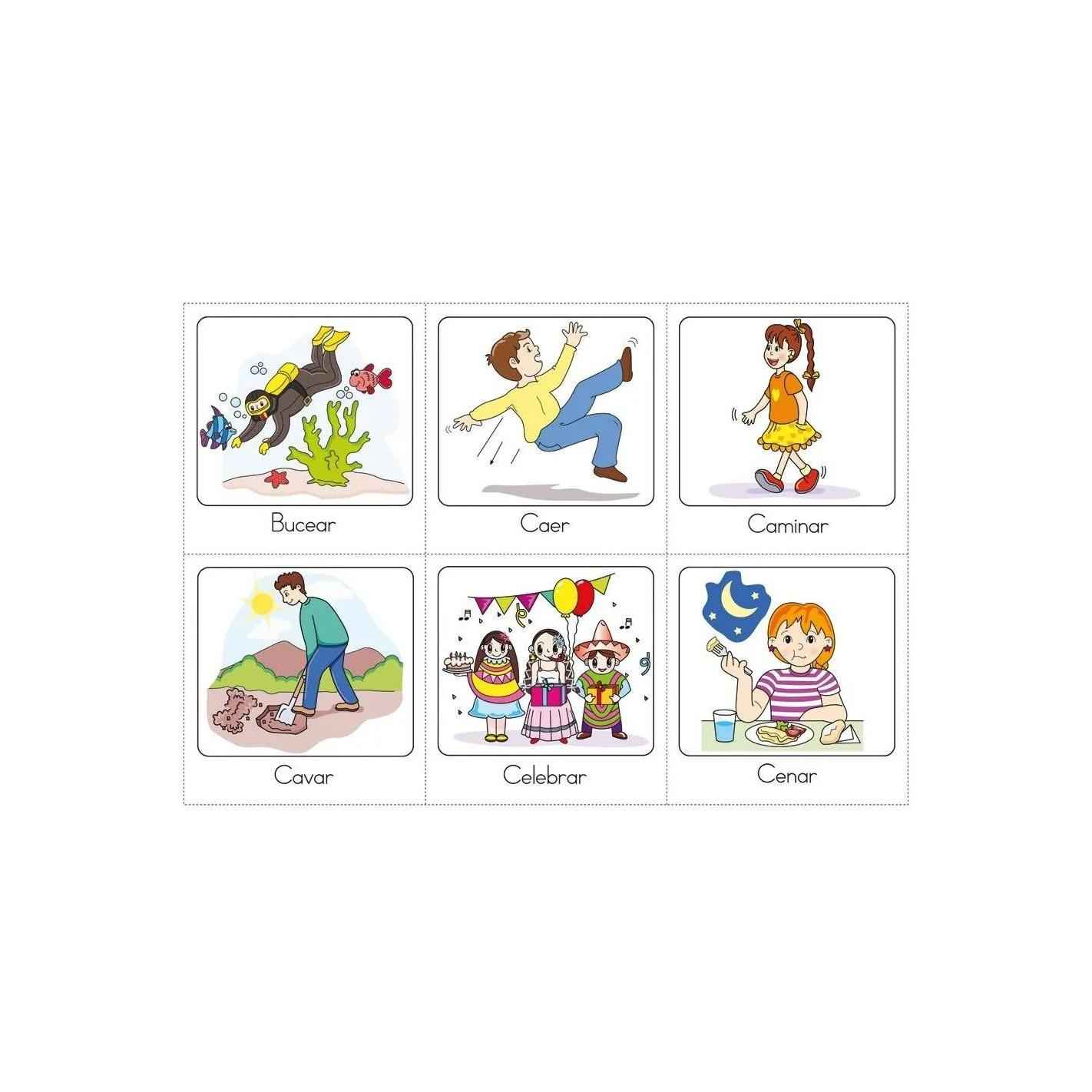 Orientado a Educación Primaria. Contiene 143 tarjetas ilustradas en alta calidad para desarrollar las distintas actividades que contiene. Algunas de las actividades que trabaja son: escribir el nombre de la acción que se realiza en cada imagen, relacionar cada dibujo con la palabra correspondiente, observar la imagen y responder, entre otros.