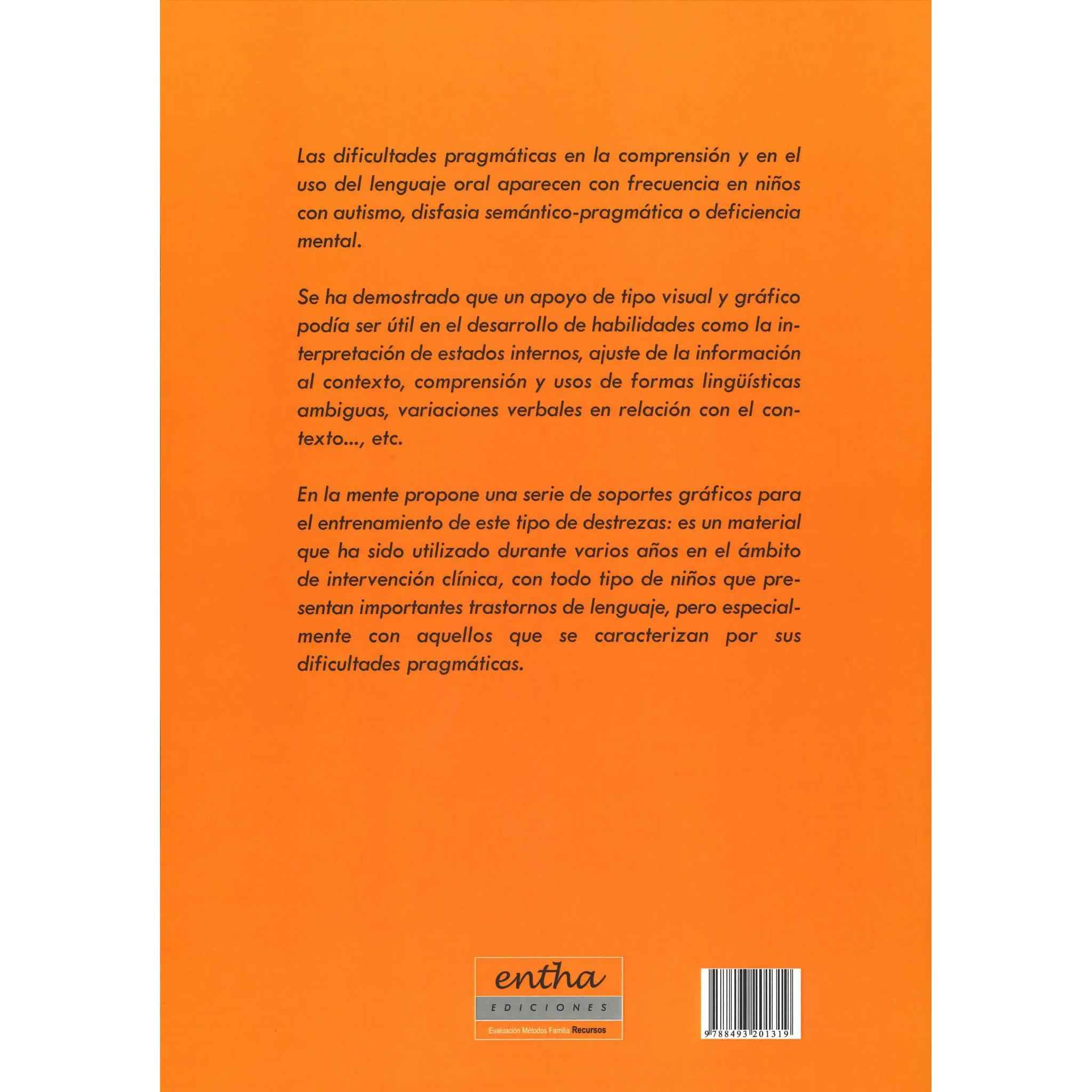 Descripción Las dificultades pragmáticas en la comprensión y en el uso del lenguaje oral aparecen con frecuencia en niños con autismo, disfasia semántico-pragmática o deficiencia mental. Se ha demostrado que un apoyo de tipo visual y gráfico podía ser útil en el desarrollo de habilidades como la interpretación de estados internos, ajuste de la información al contexto, comprensión y usos de formas lingüísticas ambiguas, variaciones verbales en relación con el contexto … etc. En la mente propone una serie de soportes gráficos para el entrenamiento de este tipo de destrezas : es un material que ha sido utilizado durante varios años en el ámbito de intervención clínica , con todo tipo de niños que presentan importantes trastornos de lenguaje pero especialmente con aquellos que se caracterizan por sus dificultades pragmáticas.