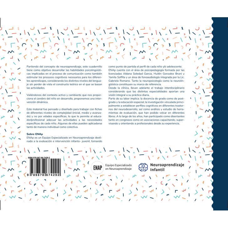 Este cuadernillo tiene como objetivo desarrollar las habilidades psicolingüísticas implicadas en el proceso de comunicación como también estimular los procesos cognitivos necesarios para los diferentes aprendizajes sin perder de vista el constructo teórico en el que se basan estas actividades. Conocer esas bases teóricas constituye el punto de partida de nuestra labor. Partimos con el concepto de neuroaprendizaje, que busca optimizar el funcionamiento del cerebro potenciando los procesos que intervienen en el aprendizaje y los diferentes niveles lingüísticos. Se tomó como modelo teórico de la comunicación el propuesto por Osgood (1957) adaptado en el ITPA (Test de aptitudes psicolingüísticas) por Von Isser y Kirk (1980). La integración de esos conceptos refleja nuestra modalidad de trabajo. Proponemos una intervención dinámica ya que nos encontramos frente a un contexto activo y cambiante como es el cerebro del niño en desarrollo. Es decir, los cerebros de los niños son “flexibles, cambiantes, funcionales y operativos” por lo que nuestra estimulación cognitiva debe ajustarse al perfil de cada niño. Este cuadernillo surge ante la necesidad de contar con un material interdisciplinario, es decir, tareas que nos permitan abordar la práctica en forma dinámica, creativa y multimodal desde la perspectiva neuropsicológica y neurolingüística. Fue pensado y diseñado para trabajar con fichas de diferentes niveles de complejidad (inicial, medio y avanzado) y no por edades específicas, lo que le permite al educador/profesional adecuar las actividades a las necesidades específicas de cada niño. Algunas de ellas pueden aplicarse tanto de manera individual como colectiva.