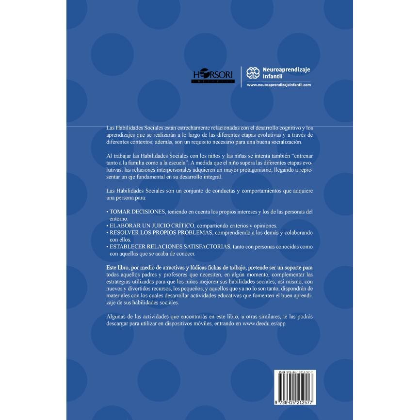 aprendizajes que se realizarán a lo largo de las diferentes etapas evolutivas y a través de diferentes contextos; además, son un requisito necesario para una buena socialización. Al trabajar las Habilidades Sociales con los niños y las niñas se intenta también “entrenar tanto a la familia como a la escuela”. A medida que el niño supera las diferentes etapas evolutivas, las relaciones interpersonales adquieren un mayor protagonismo, llegando a representar un eje fundamental en su desarrollo integral. Las Habilidades Sociales son un conjunto de conductas y comportamientos que adquiere una persona para: • TOMAR DECISIONES, teniendo en cuenta los propios intereses y los de las personas del entorno. • ELABORAR UN JUICIO CRÍTICO, compartiendo criterios y opiniones. • RESOLVER LOS PROPIOS PROBLEMAS, comprendiendo a los demás y colaborando con ellos. • ESTABLECER RELACIONES SATISFACTORIAS, tanto con personas conocidas como con aquellas que se acaba de conocer. Este libro, por medio de atractivas y lúdicas fichas de trabajo, pretende ser un soporte para todos aquellos padres y profesores que necesiten, en algún momento, complementar las estrategias utilizadas para que los niños mejoren sus habilidades sociales; así mismo, con nuevos y divertidos recursos, los pequeños, y aquellos que ya no lo son tanto, dispondrán de materiales con los cuales desarrollar actividades educativas que fomenten el buen aprendizaje de sus habilidades sociales.