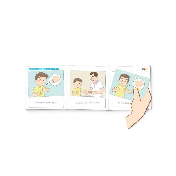 Cada viñeta viene asociada a una frase que la describe, lo que nos da la posibilidad de trabajar la comprensión lectora. Las historias se podrán trabajar de menor a mayor complejidad dependiendo de la persona con la que estemos trabajando, siendo estas de 2, 3, 4 a 5 viñetas. Este material contiene: 20 historias de 2 viñetas. 20 historias de 3 viñetas. 20 historias de 4 viñetas. 20 historias de 5 viñetas. 4 pautas para ordenar las historias. 280 frases que describen cada una de las viñetas.