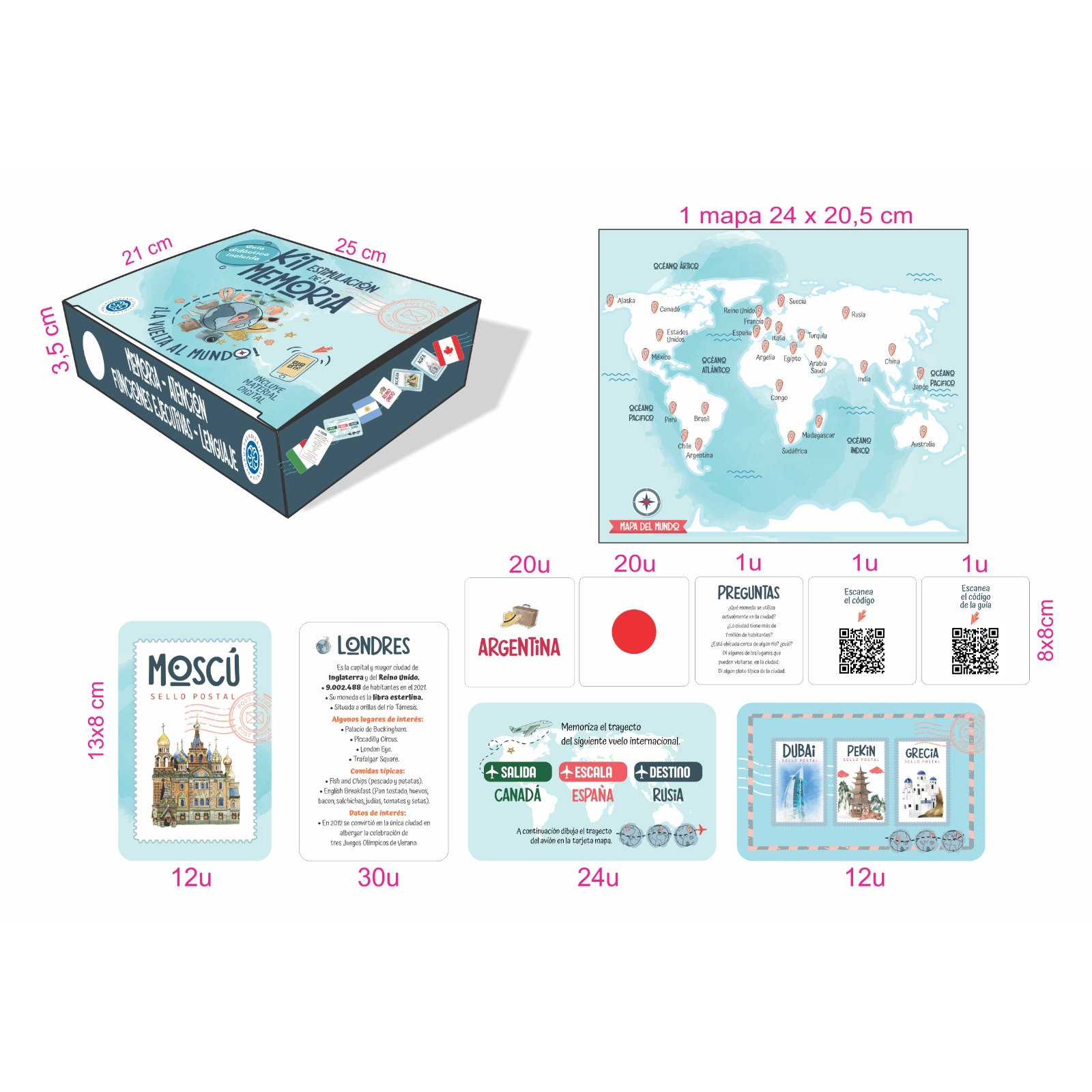 Este Kit ha sido creado con el objetivo de trabajar la MEMORIA de una forma más dinámica, ofreciendo además un componente educativo con su temática “La vuelta al mundo” con la que aprenderemos y conoceremos más acerca de diferentes países y ciudades 🌎.