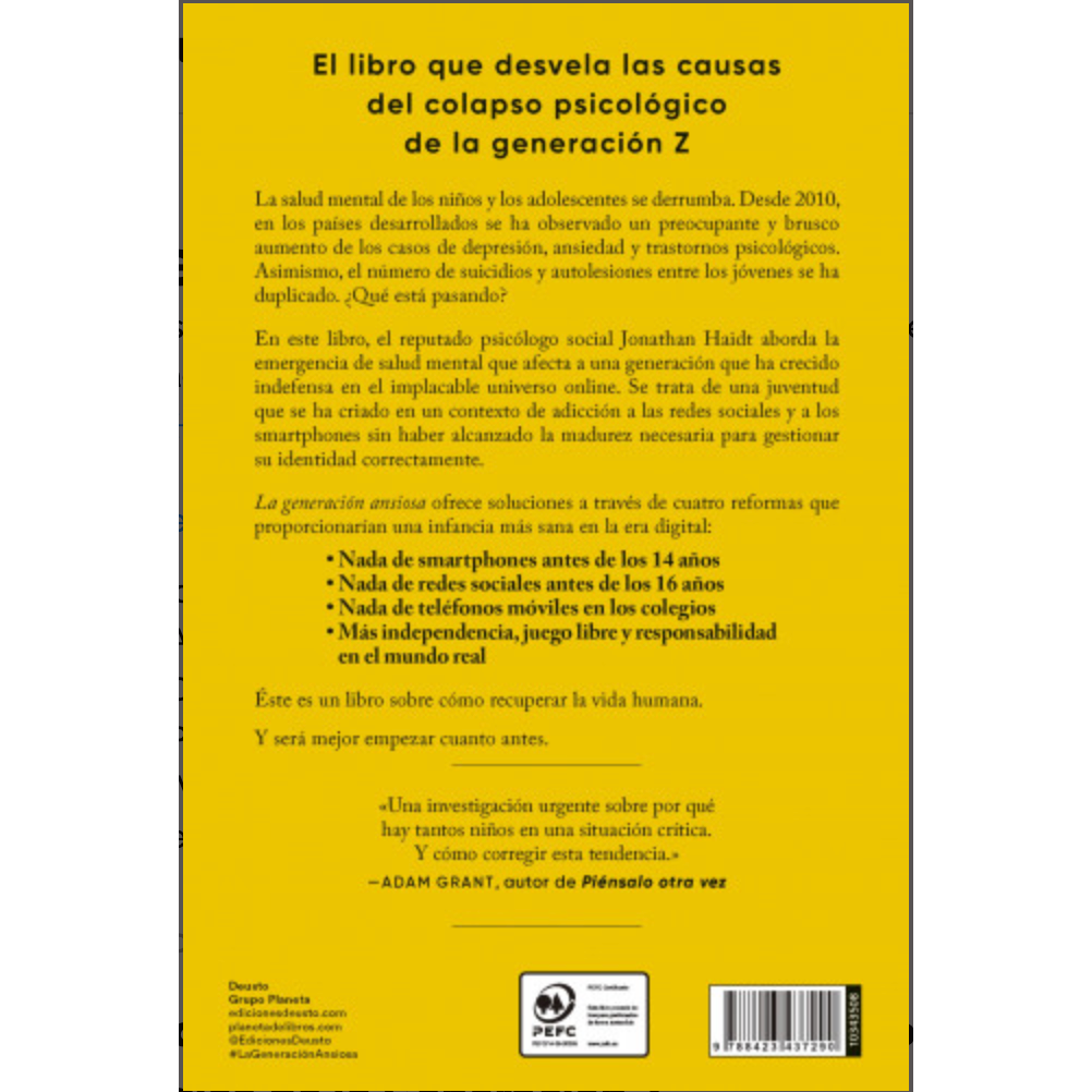 En este libro, el reputado psicólogo social Jonathan Haidt aborda la emergencia de salud mental que afecta a una generación que ha crecido indefensa en el implacable universo online. Se trata de una juventud que se ha criado en un contexto de adicción a las redes sociales y a los smartphones sin haber alcanzado la madurez necesaria para gestionar su identidad correctamente.