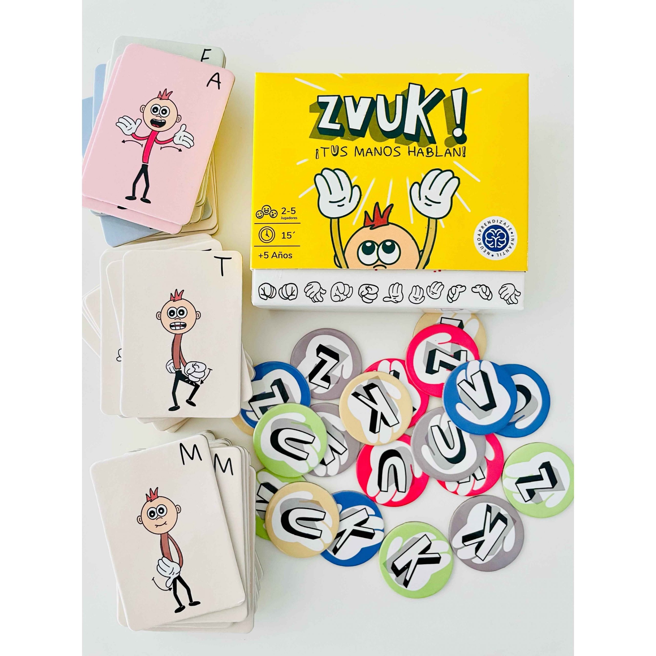 Zvuk es más que un juego! Ni más ni menos que te hace sentir a través del movimiento del cuerpo cada uno de los sonidos (logotomas) que producimos al hablar. Estos movimientos no son creados al azar, sino que forman parte de toda una metodología. La metodología verbotonal creada en su inicio por Petar Guberina (lingüista Croato) y de ahí el nombre del juego Zvuk que su traducción en croata es sonido.En función de las características de cada sonido, creamos un movimiento que podéis ver en el vídeo a través del código QR que aparece en la caja. Estos movimientos reflejan las características de cada sonido del habla en función de la tensión, tiempo, frecuencia, espacio, intensidad y cualidad. De ahí que sea algo más que un juego, pues se puede utilizar como material terapéutico para niños o adultos con problemas en el aspecto fonético-fonológico y en todos aquellos que necesiten reforzar la memoria visual y auditiva. Para utilizar el juego de manera terapéutica: Podemos ir aprendiendo carta a carta cada uno de los sonidos e ir creando el movimiento a la vez que lo pronunciamos. También podemos ir poniendo cada tarjeta boca arriba e ir tapándola conforme vamos introduciendo una a una el resto de tarjetas. De esta forma van memorizando los sonidos y cada una de las letras que forman dicho fonema. Incluso si se quiere podemos formar alguna palabra.